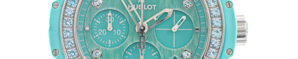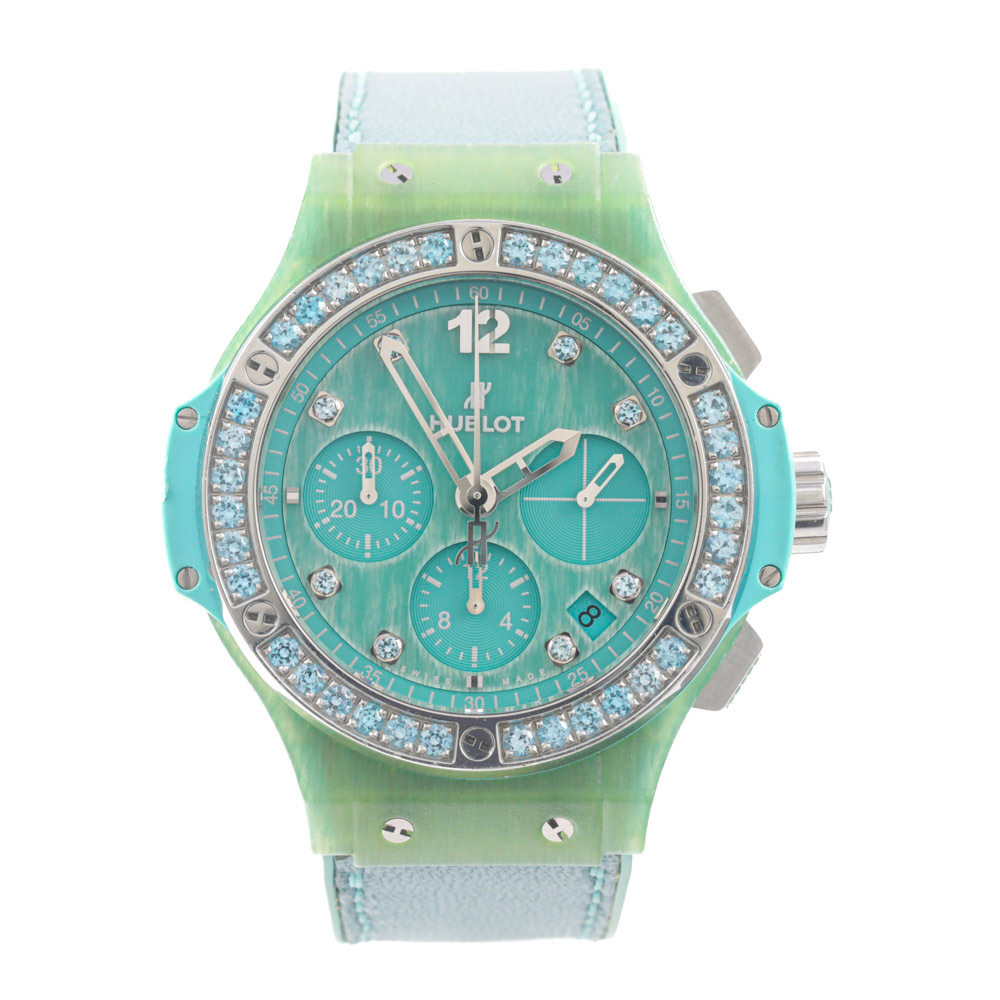 Type: Hublot Ref# 341.XL.2770.NR.1237 Big Bang Tutti Frutti Limited Edition of 200 pieces, composite resin and stainless steelDial: Turquoise colour chronograph dial with Topaz indicators, date window at 4:30 position and scratch-resistant sapphire crystal.
